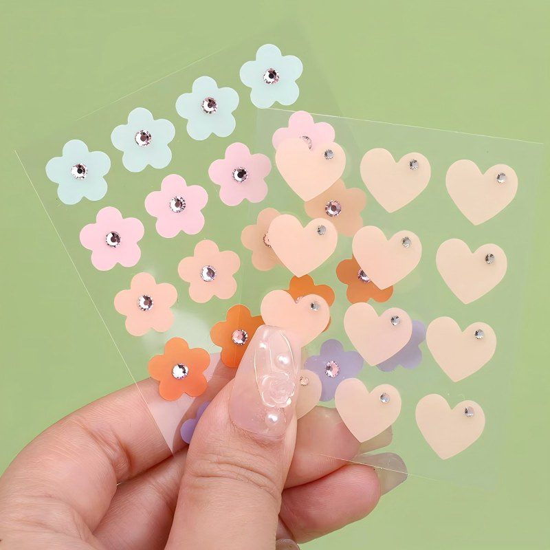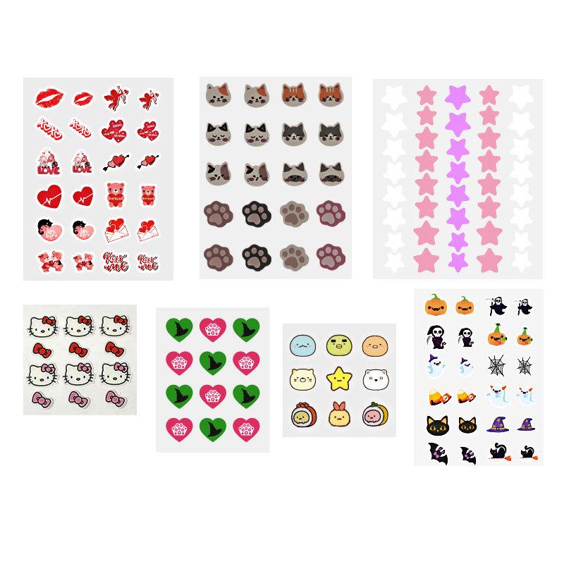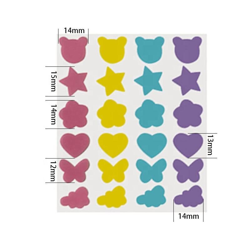 Regular stock in supply pink, blue, yellow, green, purple cute animal print acne patch for face, clear round pimple patch, skin color pimple patch, flower patch, heart shape, butterfly shape, star shape, cloud shape, smile design spot sticker, glitter acne patch, large full face patch for forehead,chin, smile line. Custom patch in special size and shapes, printing designs as client's request.