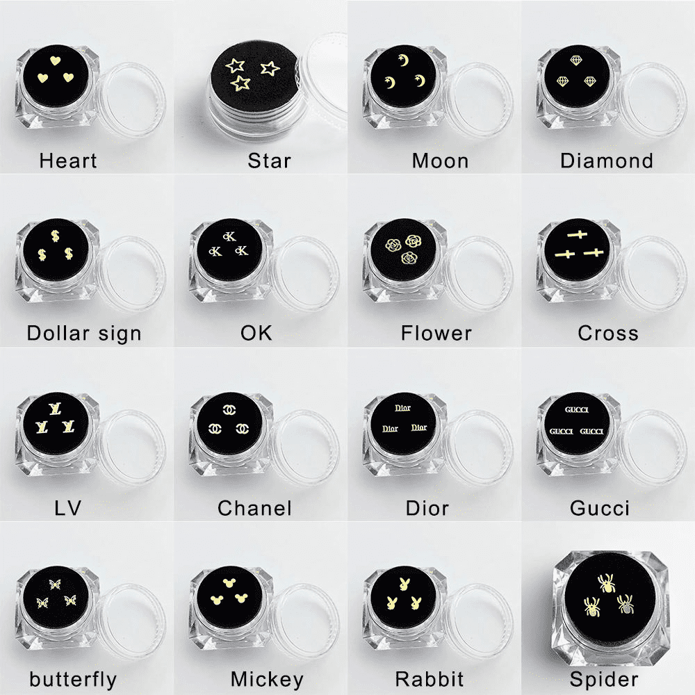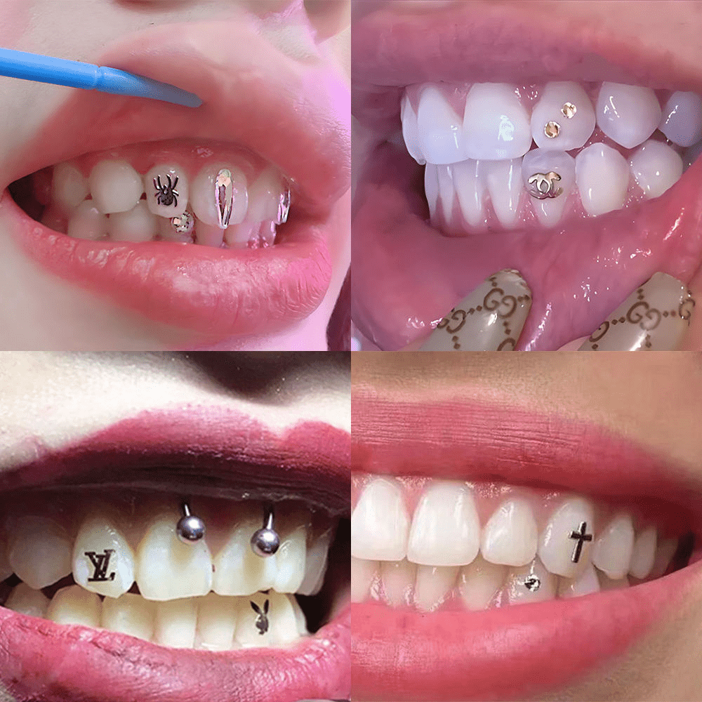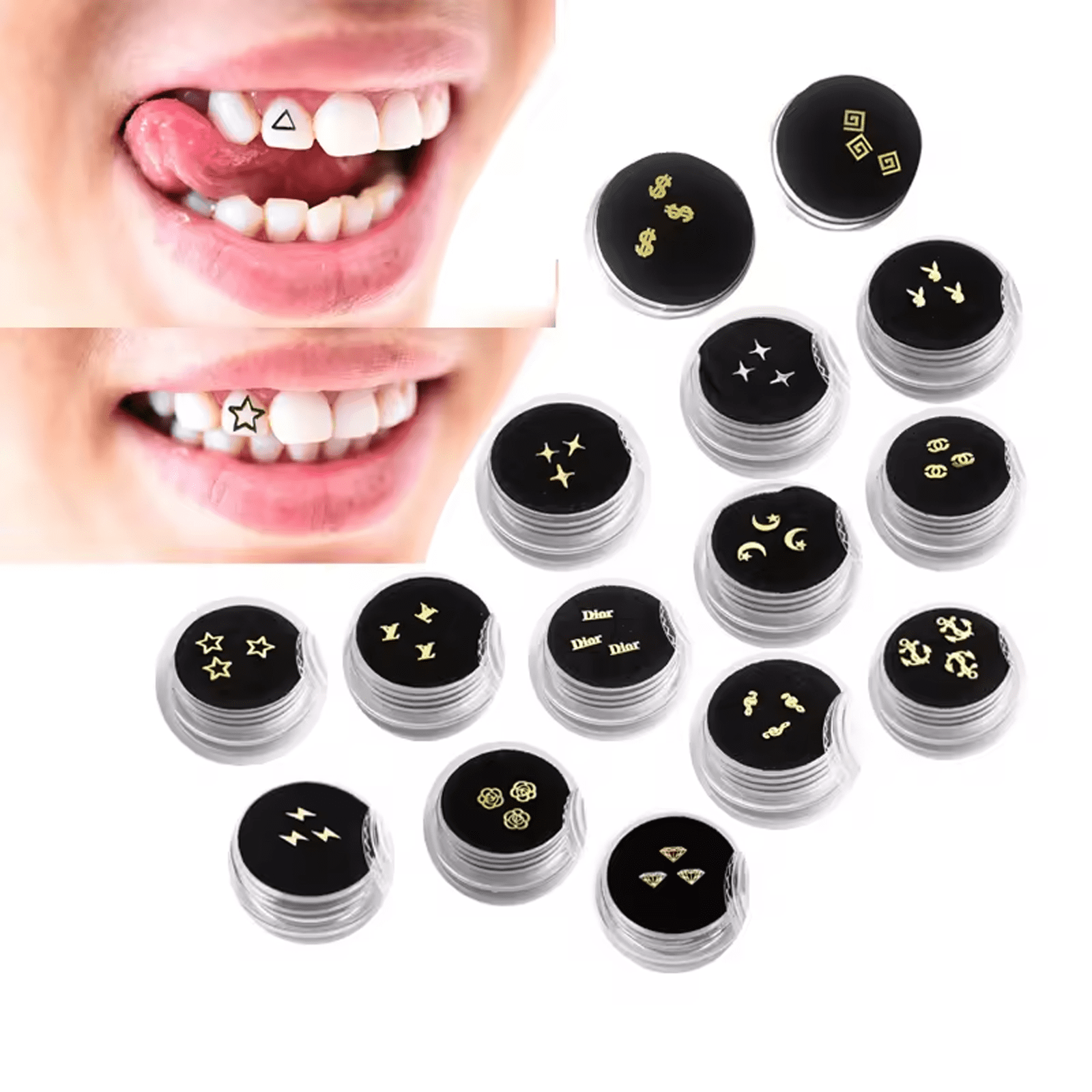 18K tooth gems include heart, star, butterfly, animals and designer brands. They are very sold and durable for max long wear time. Available in gold and silver, the metal designs are professionally bonded to the surface of your teeth securely and quickly under proper application.
