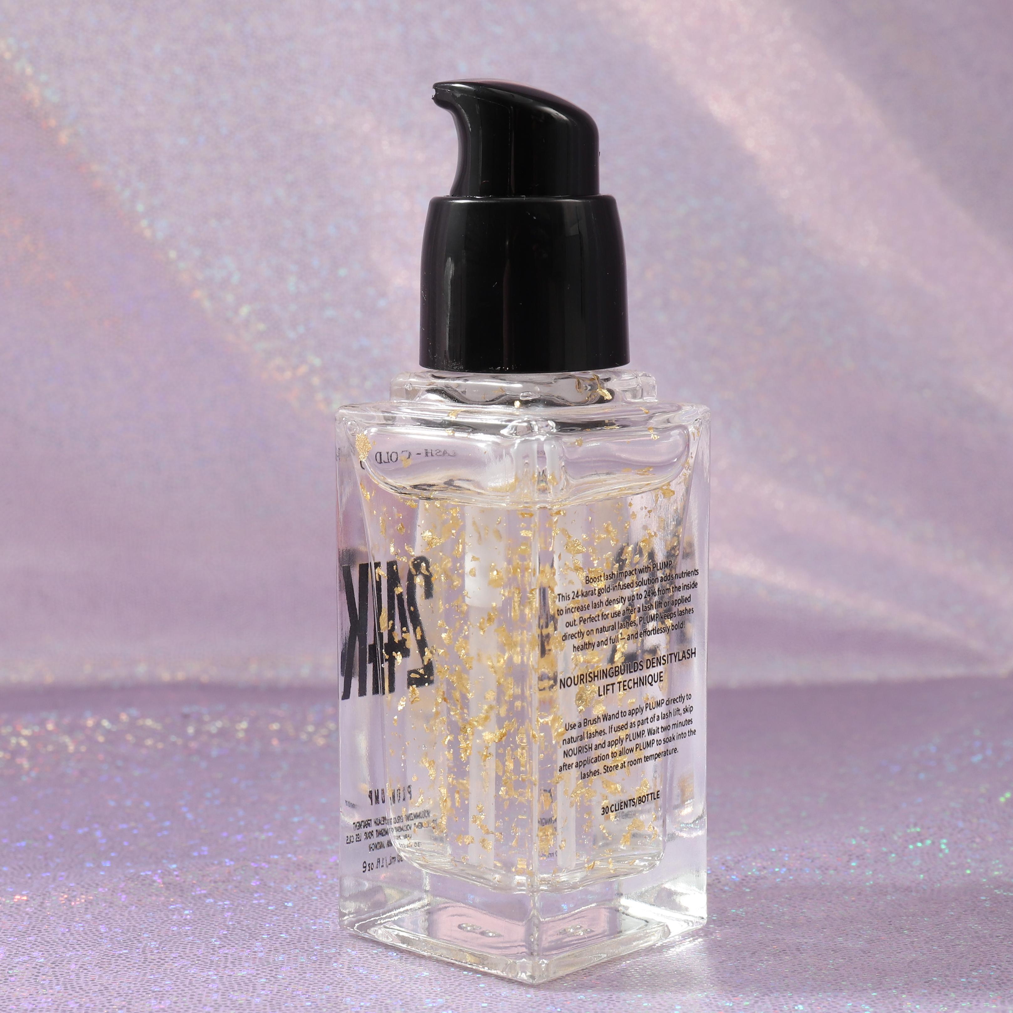 The lightweight formula is easy to apply and absorbs quickly, leaving no residue. Achieve the lashes of your dreams with our 24K Plump. Rich in Nourishing Ingredients, the 24K gold serum comes in a convenient pump bottle for precise, easy application. It ensures lashes remain soft, shiny, beautifully conditioned, and appear plumper. Accept private label on the gold lash brow serum.