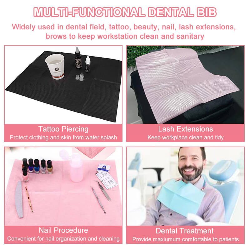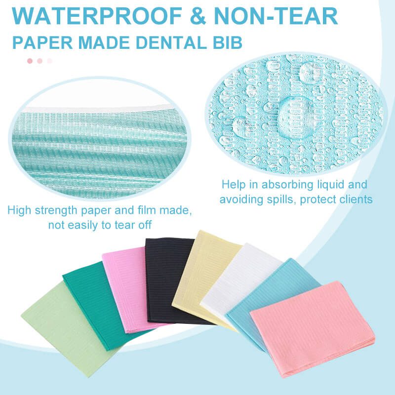 Our standard size dental bibs are designed for strength and absorbency for maximum comfortable usage. The bibs are waterproof and oil proof. Available in pink, blue, pink, white, black, purple, 125 per per bag.