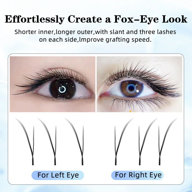 The special shape lashes have a double Y shape with a slight slant angle. The premade fans have been designed to make a flawless and wispy fox-eye effect in short time. They are ideal for soft and sultry sets. Easily to archieve spiky and wispy volume lashes without making handmade fans. Slant yy lashes are perfect for hybrid lash set, textured and fast volume lash application.
