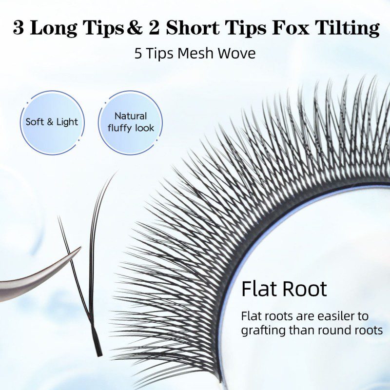 Total 5 lash tips are mesh woven, slant yy lashes effectively make lash application speedy up to 50%. The flat roots are more easy to adhere with natural lash for long retention. With shorter inner length and longer outer length, the slant lashes effortlessly create a fox-eye look. Our yy lashes have very stable curl in C and D.